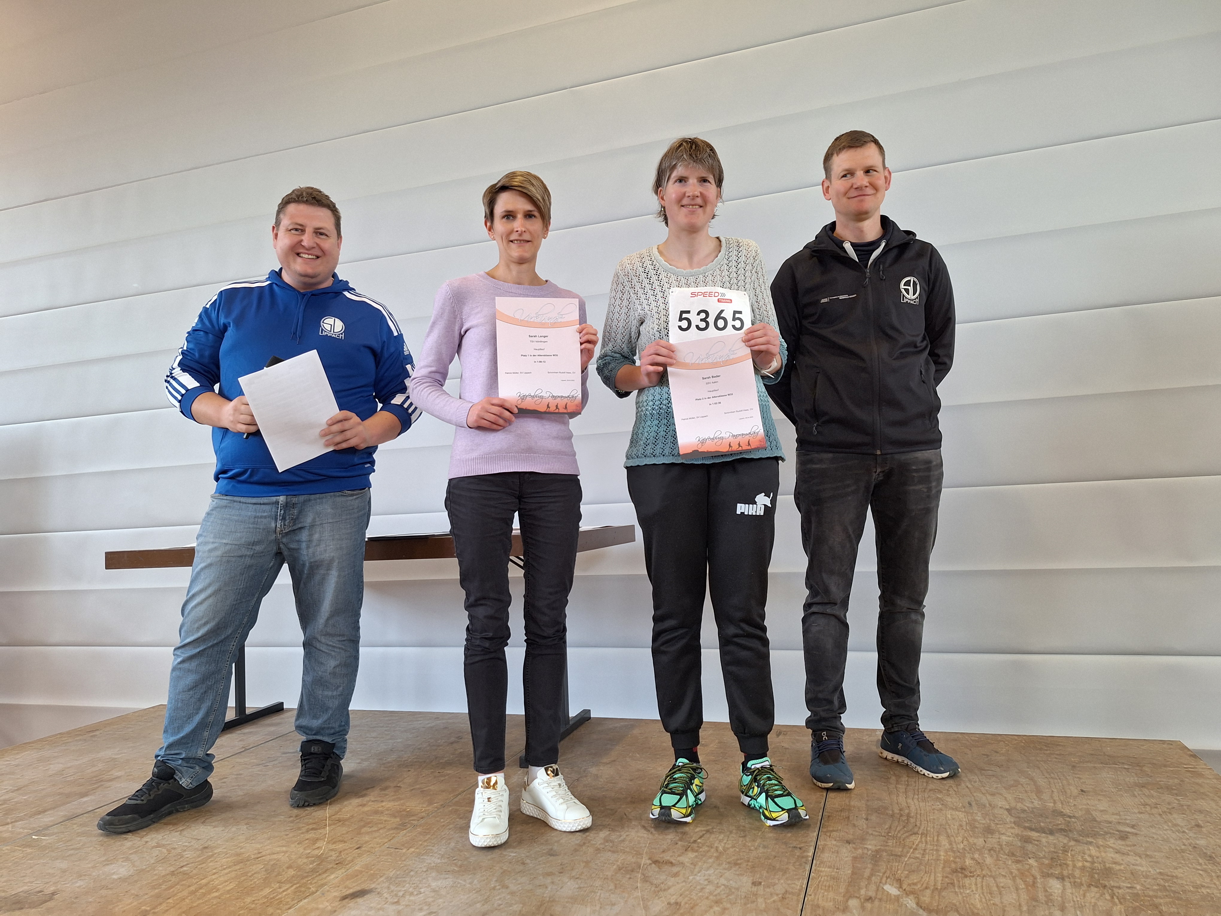 Bei der Siegerehrung, von links, Veranstalter, Sarah Langer 1. W35, Sarah Bader 2. W35, Veranstalter. (Foto: Hans Niederhuber)