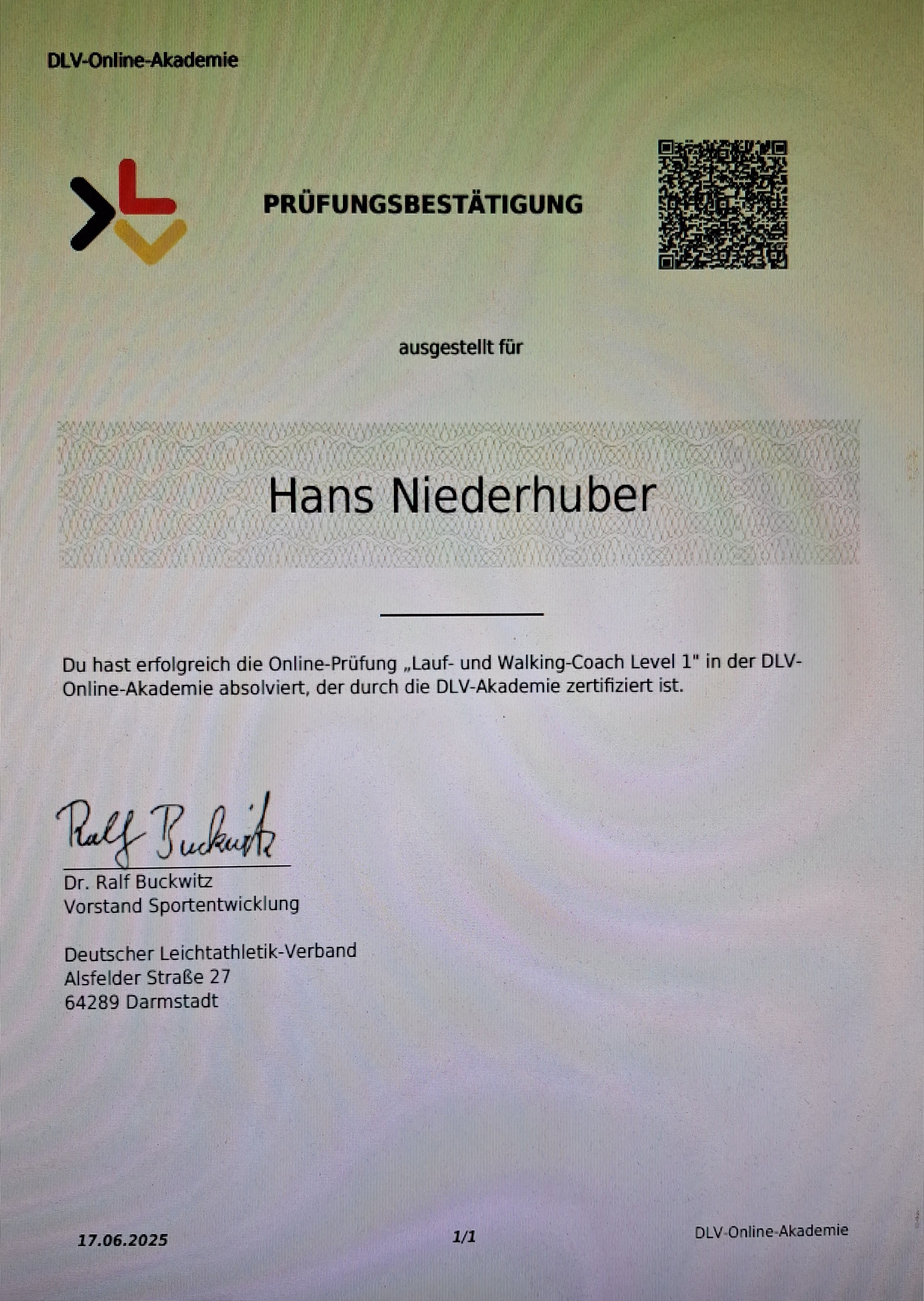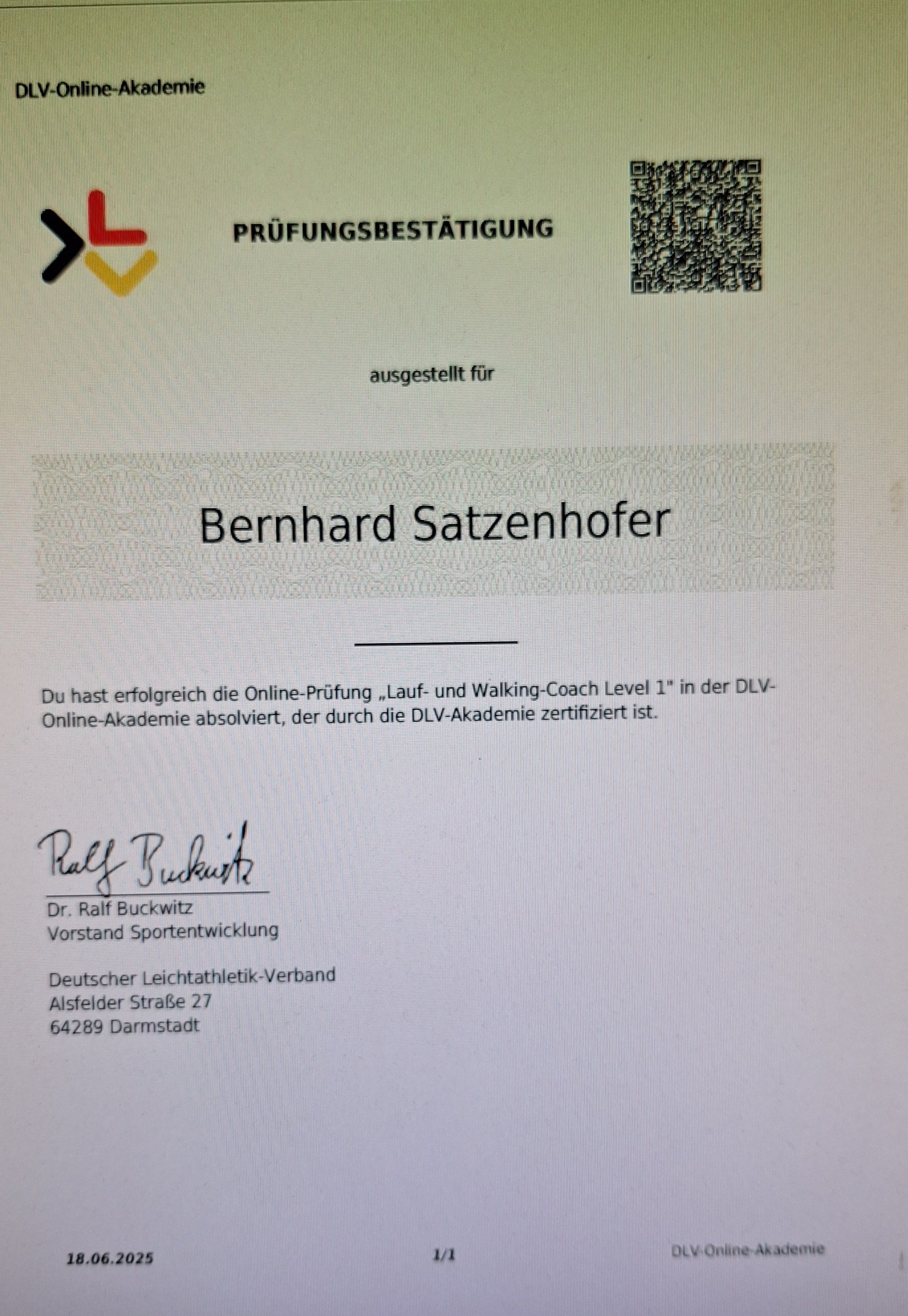 Voraussetzung zur Teilnahme an dem Kurs war die Ausbildung zum Lauftreff Gruppenleiter, der in diesem Jahr zum letzten Mal in Neuhaus stattfindet. Dieses gültige Cetifikat besaßen auch Bernhard Satzenhofer und Hans Niederhuber vom Lauftreff des TSV Nördlingen. Die Ausbildung umfasste 15 Unterrichtseinheiten in Theorie und Praxis über das richtige Trainieren, Lauftechnik, Analyse und Korrekturen, sowie anatomisch - physiologische Grundlagen des Bewegungsapparats und des Herz-Kreislaufsystems. Nach Beendigung des informationreichen Wochenende erhielten alle 13 Teilnehmer eine Teilnahmebestätigung. Die Prüfung musste in der zertifizierten DLV Online Akademie abgelegt werden. Hans Niederhuber und Bernhard Satzenhofer legten die Prüfung mit Erfolg ab und können nun das Erlernte im Lauftreff und im Laufkurs weitergeben.