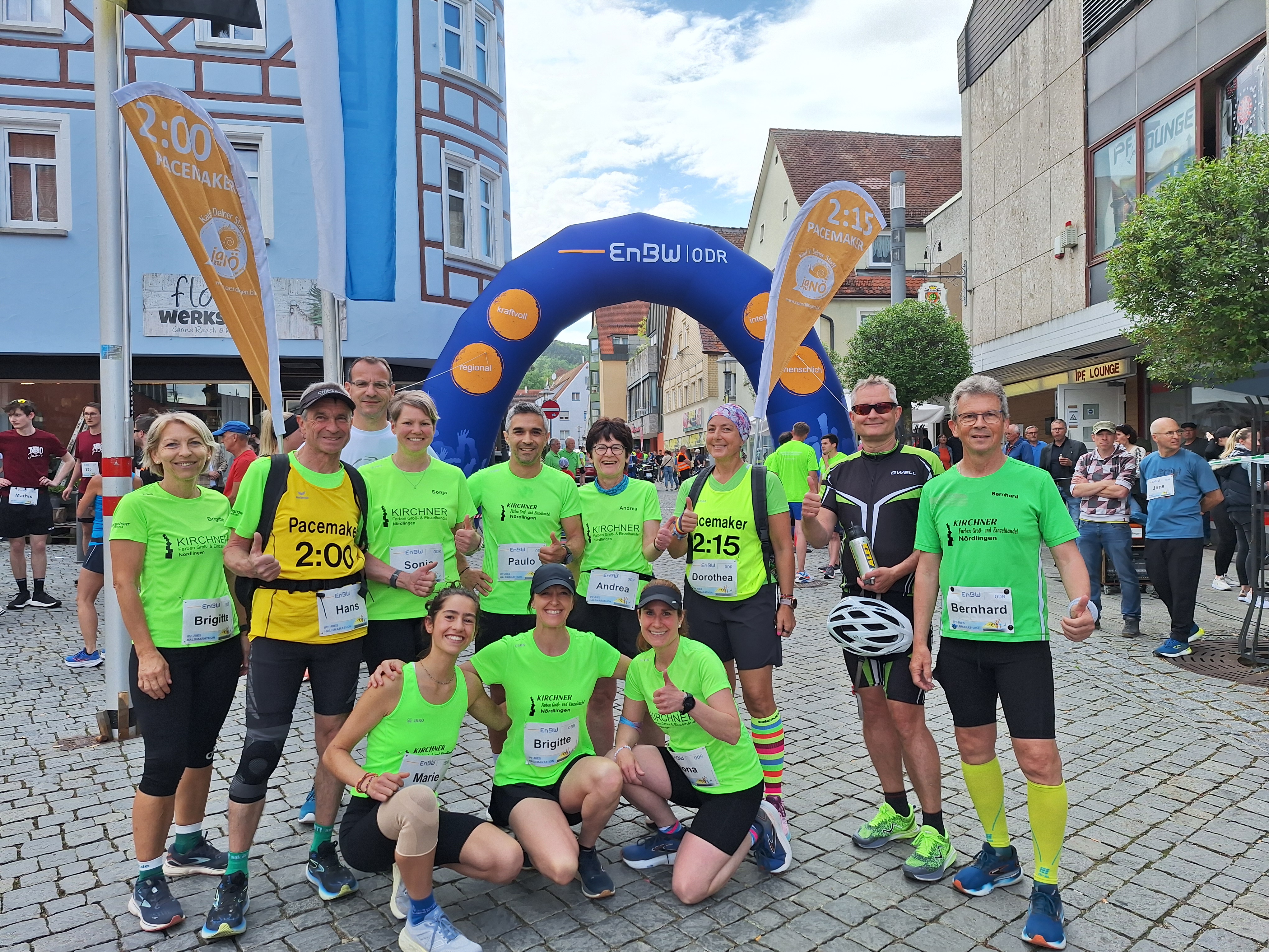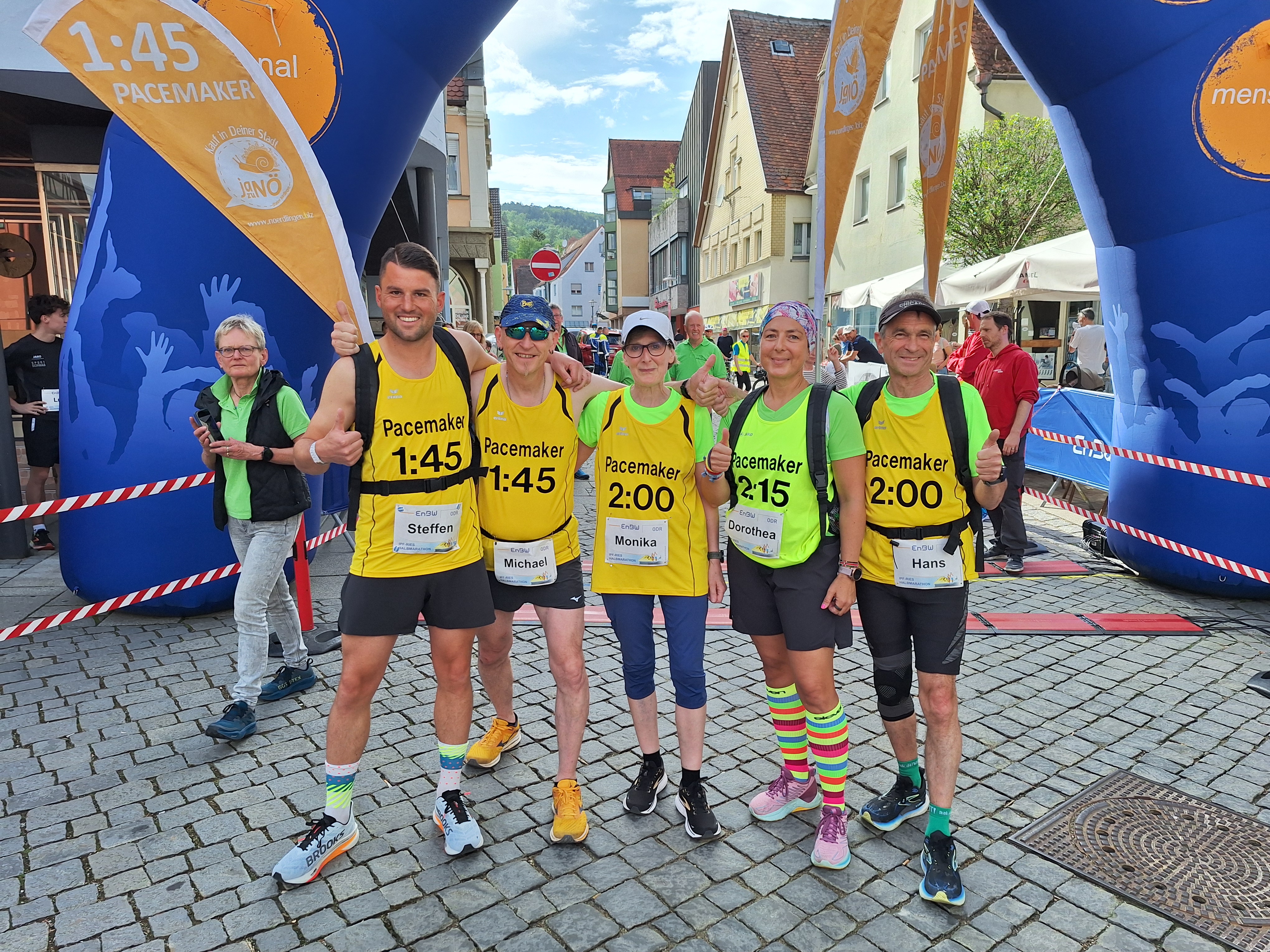 An der langen Steigung von Nähermemmingen nach Holheim mussten viele Teilnehmer, die zu schnell angegangen sind ihren Tribut zollen. Dafür wartete die nächste Verpflegung mit musikalischem Empfang durch die Fire Devils und der zweiten Wechselstation fast am höchsten Punkt der Strecke. Von dort ging es bergab, bzw. flach weiter nach Kleinerdlingen wo die nächste Verpflegung wartete. Den Daniel schon im Blick musste am Südtiroler Viertel in Nördlingen nochmal die Richtung bis zur Lohmühle geändert werden. Die Nördlinger Altstadt erreichte man durch das Baldinger Tor, von dort ging es über den Marktplatz durch das Reimlinger Tor über die Ziellinie.